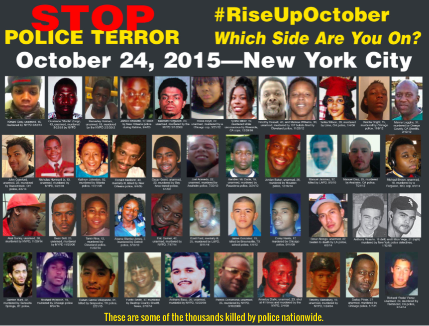 We refuse to accept the non-indictments in the murders of Michael Brown and Eric Garner and many, many others across the U.S. These police murders and the non-indictments are declarations that police can wantonly kill Black and Brown people and that Black and Brown lives do not matter.